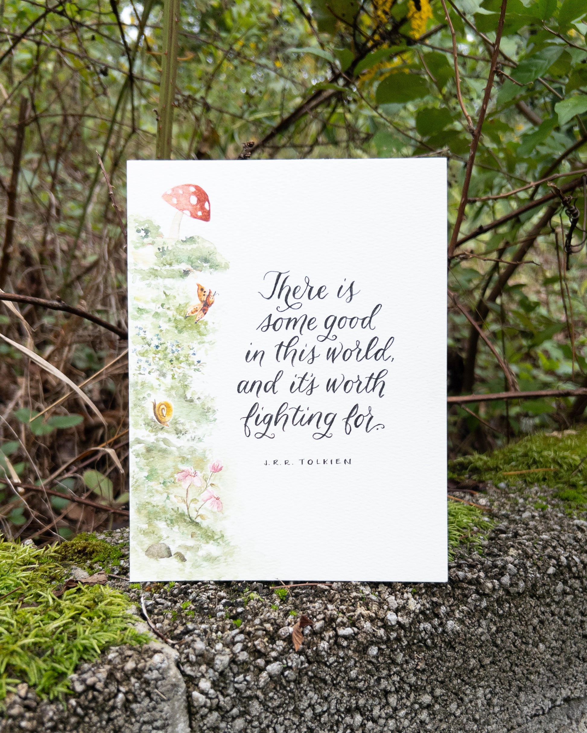 Decorate a reading corner with this unique 6" x 8" (15.2 cm x 20.3 cm) piece featuring a snail, butterfly, and delicate flowers in their mossy woodland home. Hand-painted in watercolor on cold-press watercolor paper. The hand-lettered quote by J.R.R. Tolkien reads, "There is some good in this world, and it's worth fighting for."