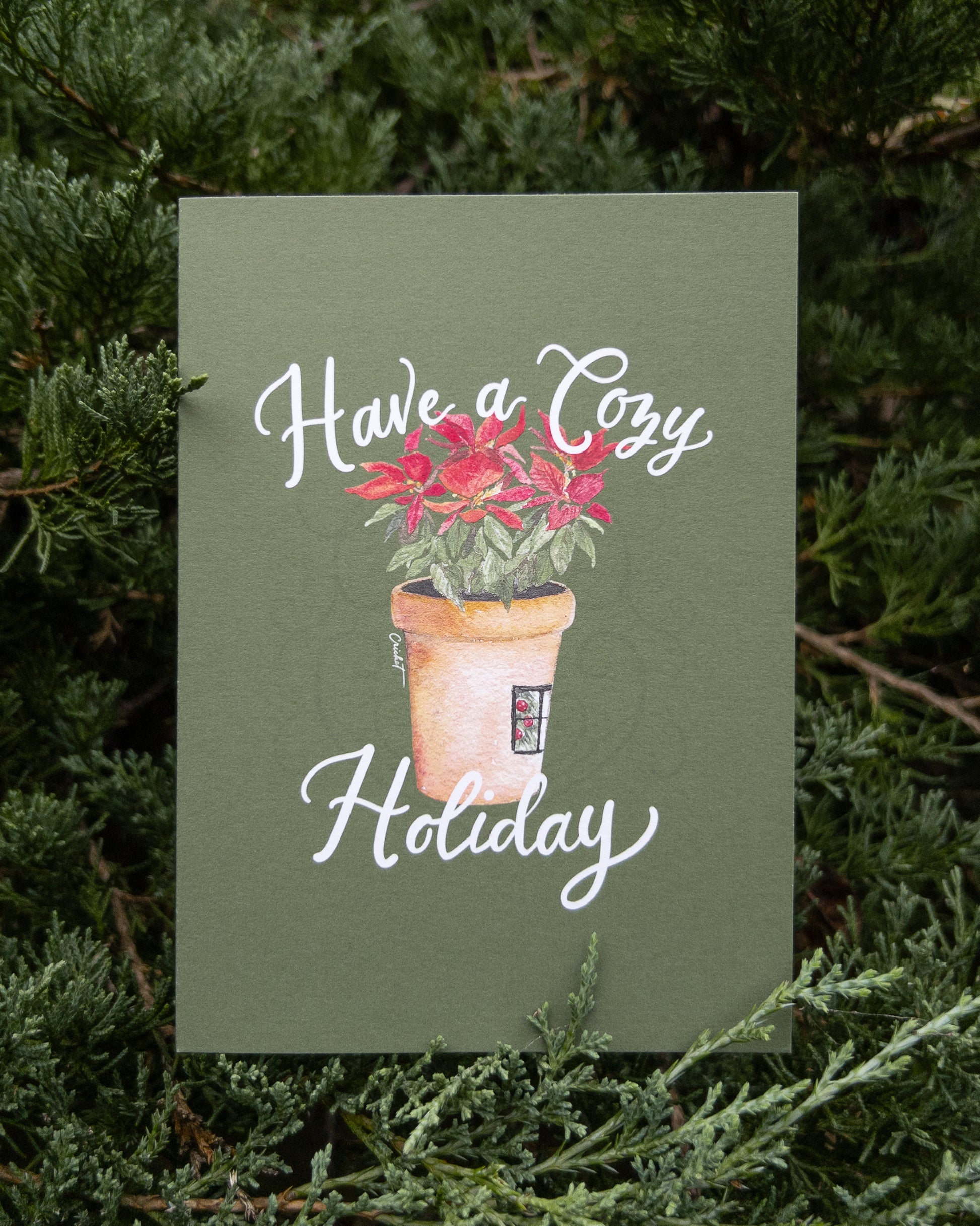 This printed card design features an original watercolor painting of a tiny home in a poinsettia pot and original digital calligraphy that reads "Have a cozy holiday." Choose between hand-applied glitter or no glitter.