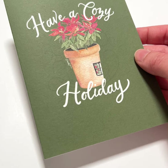 This printed card design features an original watercolor painting of a tiny home in a poinsettia pot and original digital calligraphy that reads "Have a cozy holiday." Choose between hand-applied glitter or no glitter (video shows the hand-applied glitter version).