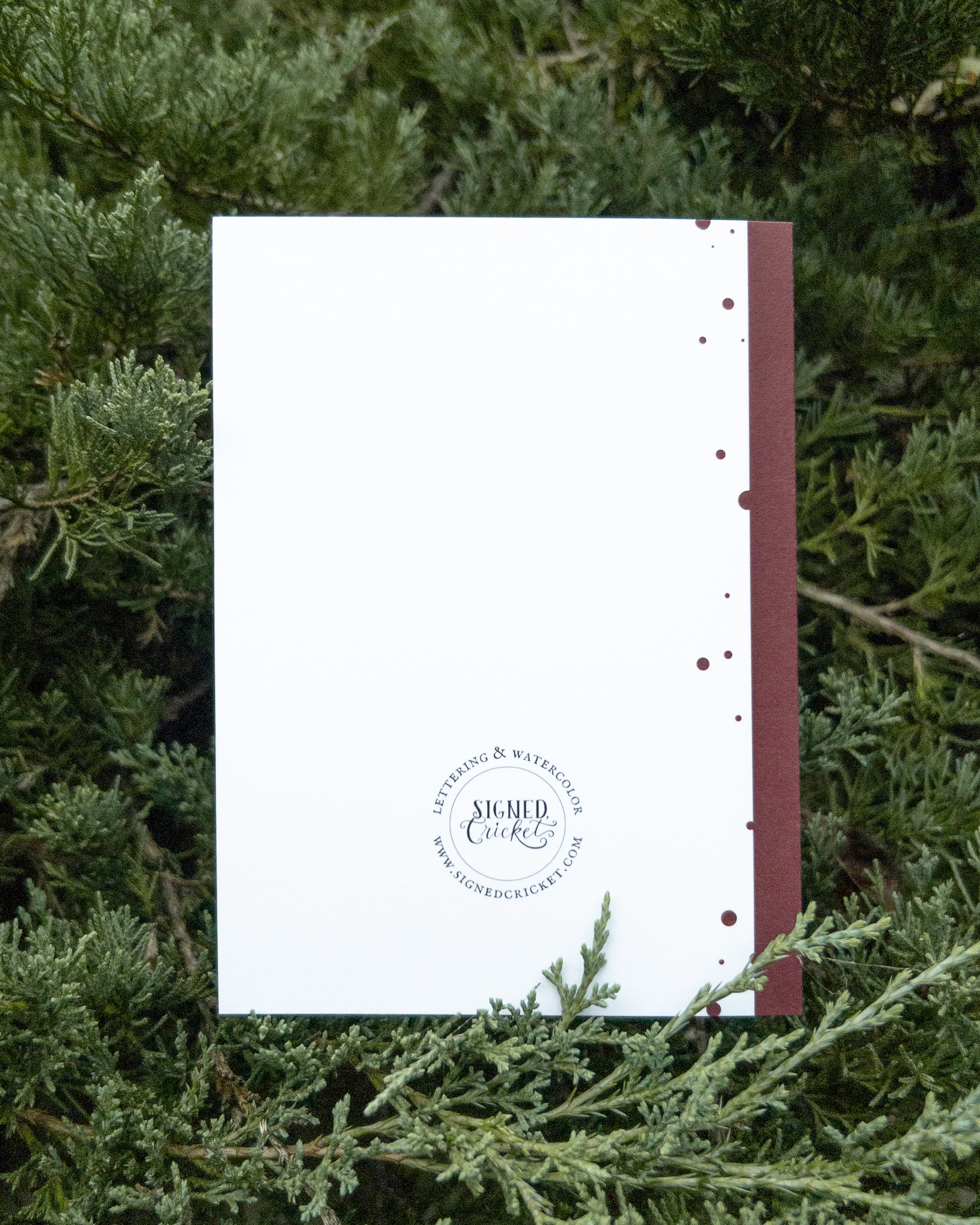 This printed card design features an original watercolor painting of a tiny home in a poinsettia pot and original digital calligraphy that reads "Have a cozy holiday." Choose between hand-applied glitter or no glitter.