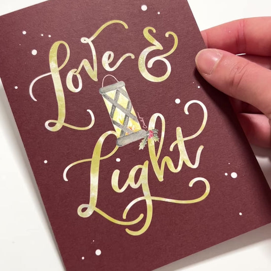 This printed card design features an original watercolor painting of a tiny home in a poinsettia pot and original digital calligraphy that reads "Have a cozy holiday." Choose between hand-applied glitter or no glitter (video shows the hand-applied glitter version).
