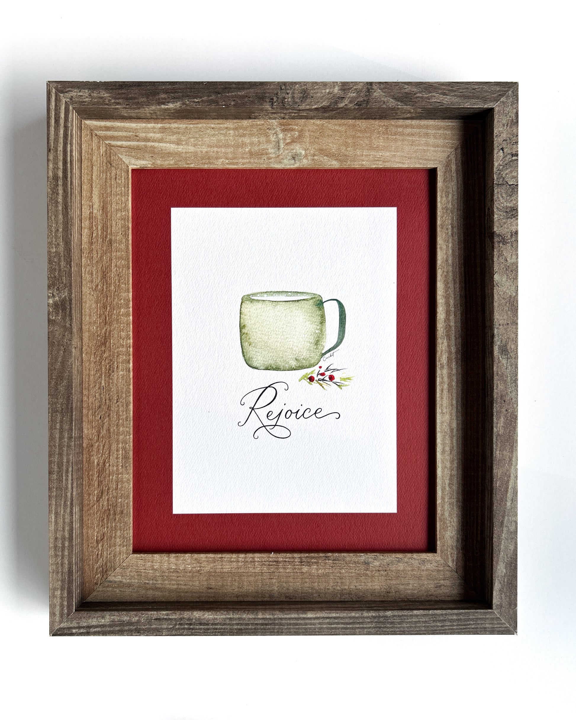 This cozy illustration of a watercolor mug and a evergreen sprig will brighten the grayest winter day. The hand-lettered calligraphy message is intentionally simple so that you can keep this piece on display after the holidays are over, when we all need a little extra cheer ✨
