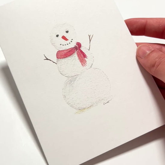 This printed card design is adapted from an original watercolor painting of a snowman with a red scarf. Choose between hand-applied glitter or no glitter (video shows the hand-applied glitter version).